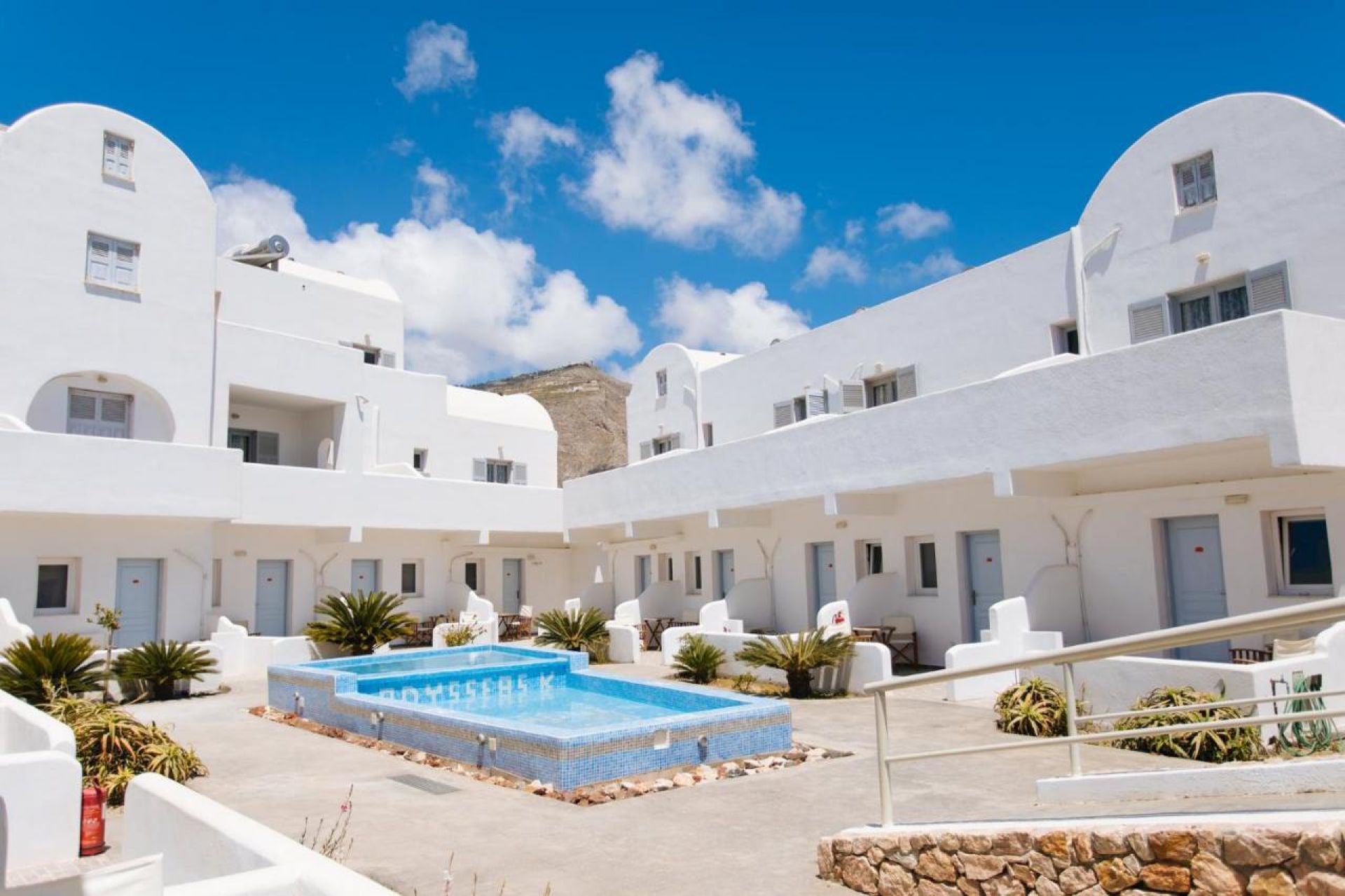 Хотелът се намира в района на Периса-Периволос, само на няколко крачки от най-хубавият пясъчен плаж на острова. Периса е 800 метра, столицата Фира на 10 км, централното пристанище Атиниос е на 7 км. Автобусна спирка на градски транспорт има на 1 минута от хотела. За всички трансфери и екскурзии, качването на туристи става директно от хотела !