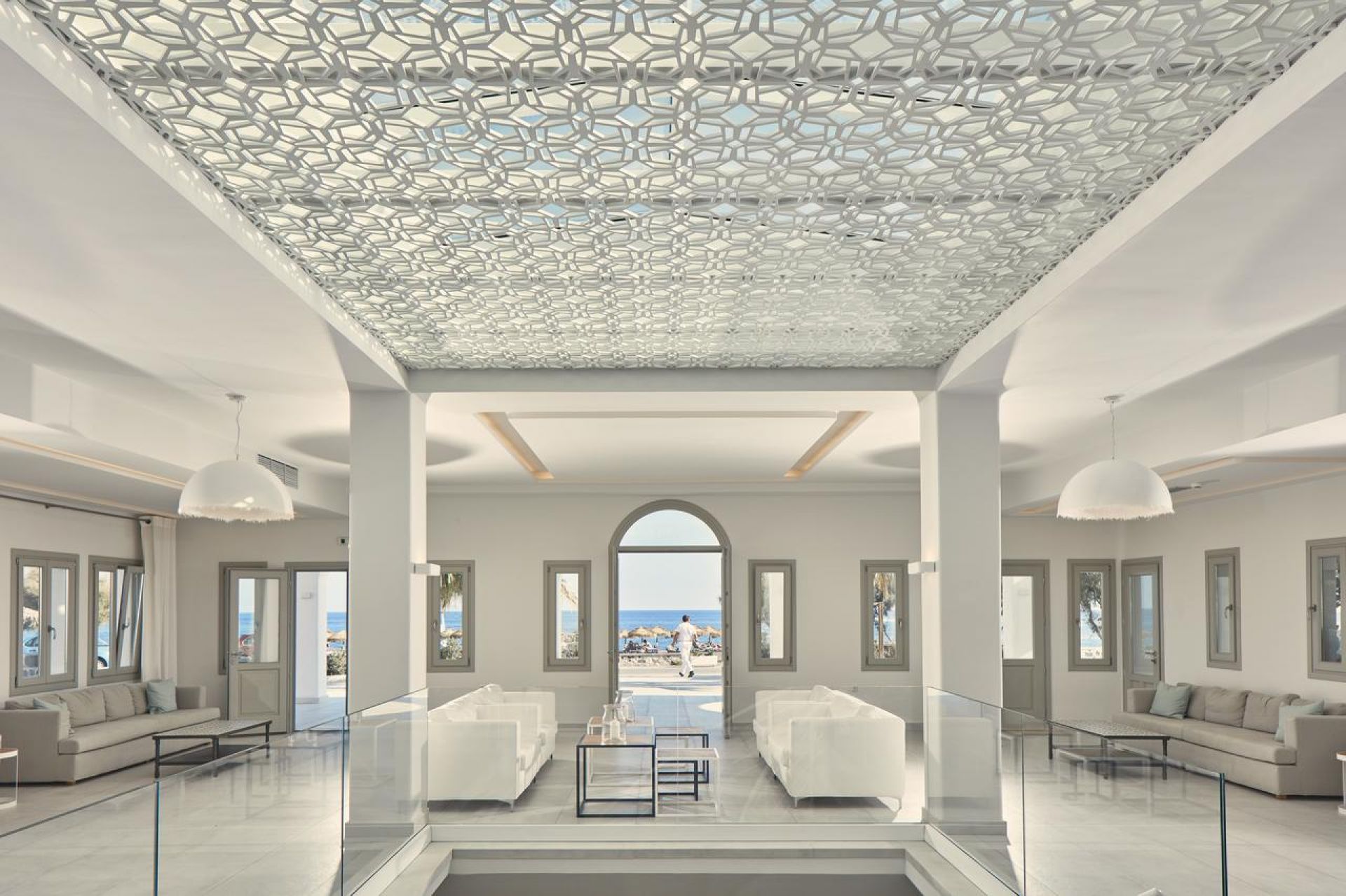 Aqua Blue Beach Hotel е разположен на плажа Периса и разполага с частен плаж с шезлонги и чадъри. Фира, оживената столица на Санторини, се намира на 15 км, а летище Санторини и пристанището са на 20 минути с автомобил. В близост до хотела има условия за водни спортове. Наблизо има и ресторанти, както и други възможности за развлечения.