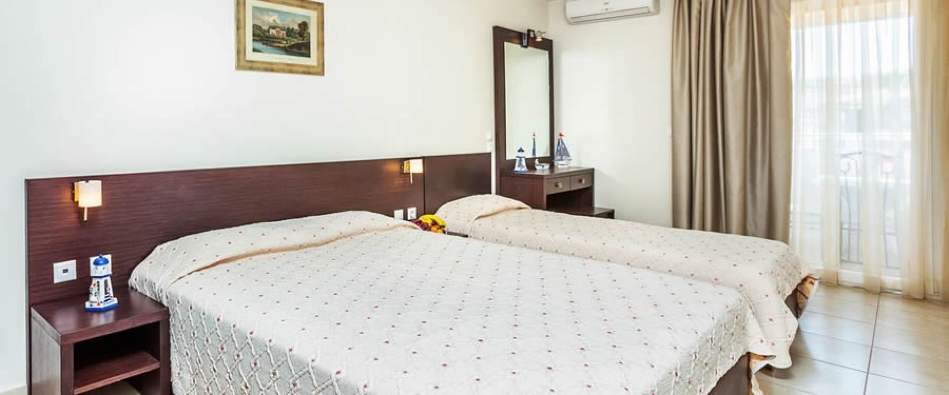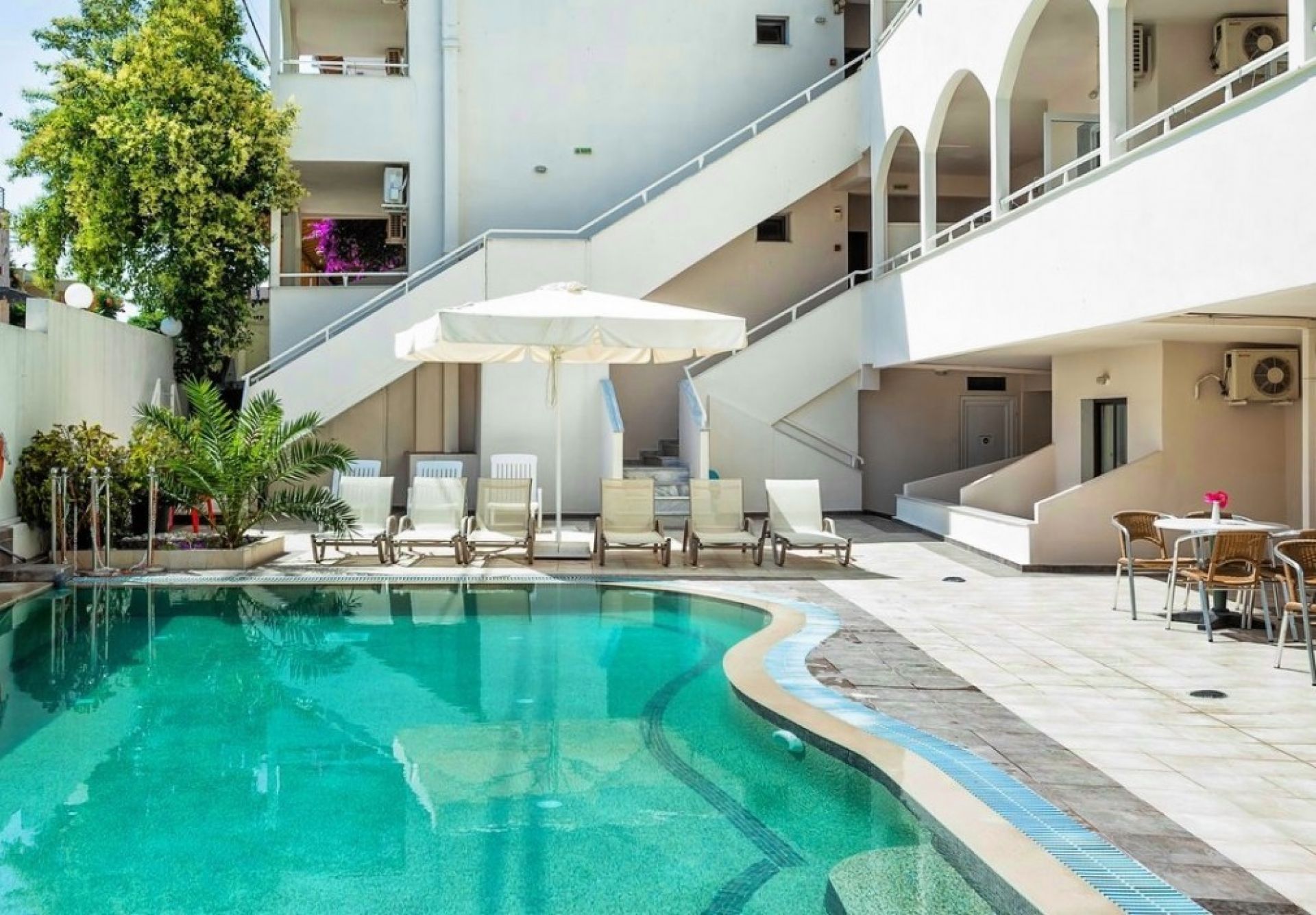 Разположение: на първия ръкав Касандра на Халкидическия полуостров, на 100 км от Солун, в живописното курортно селище Ханиоти, на около 200 метра от плажа.