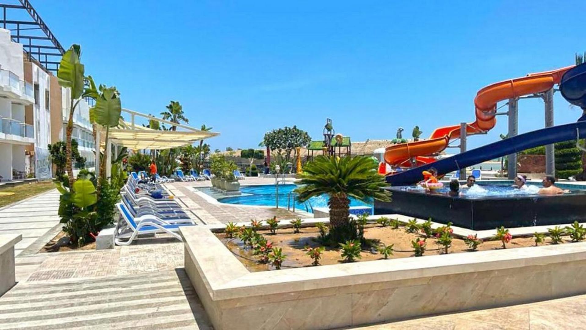 - Основен басейн, отопляем басейн, детски басейн, 2 водни пързалки за възрастни, 2 водни пързалки за деца