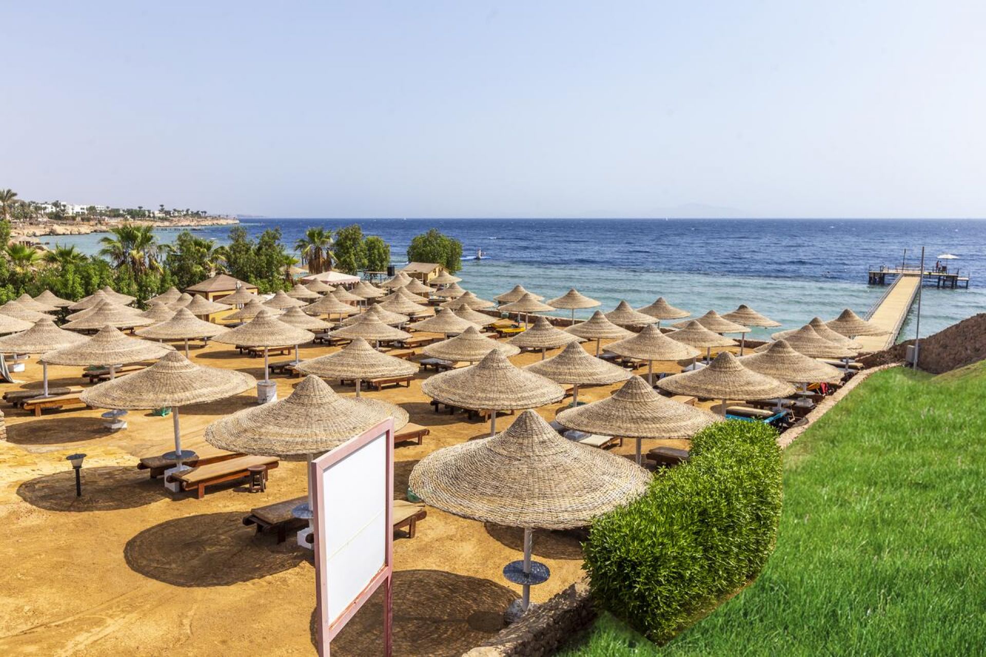 Собствен, пясъчен и коралов, кей; достига се с шатъл бус. Чадъри и шезлонги на плажа и при басейна - безплатно. Плажни кърпи - безплатно.