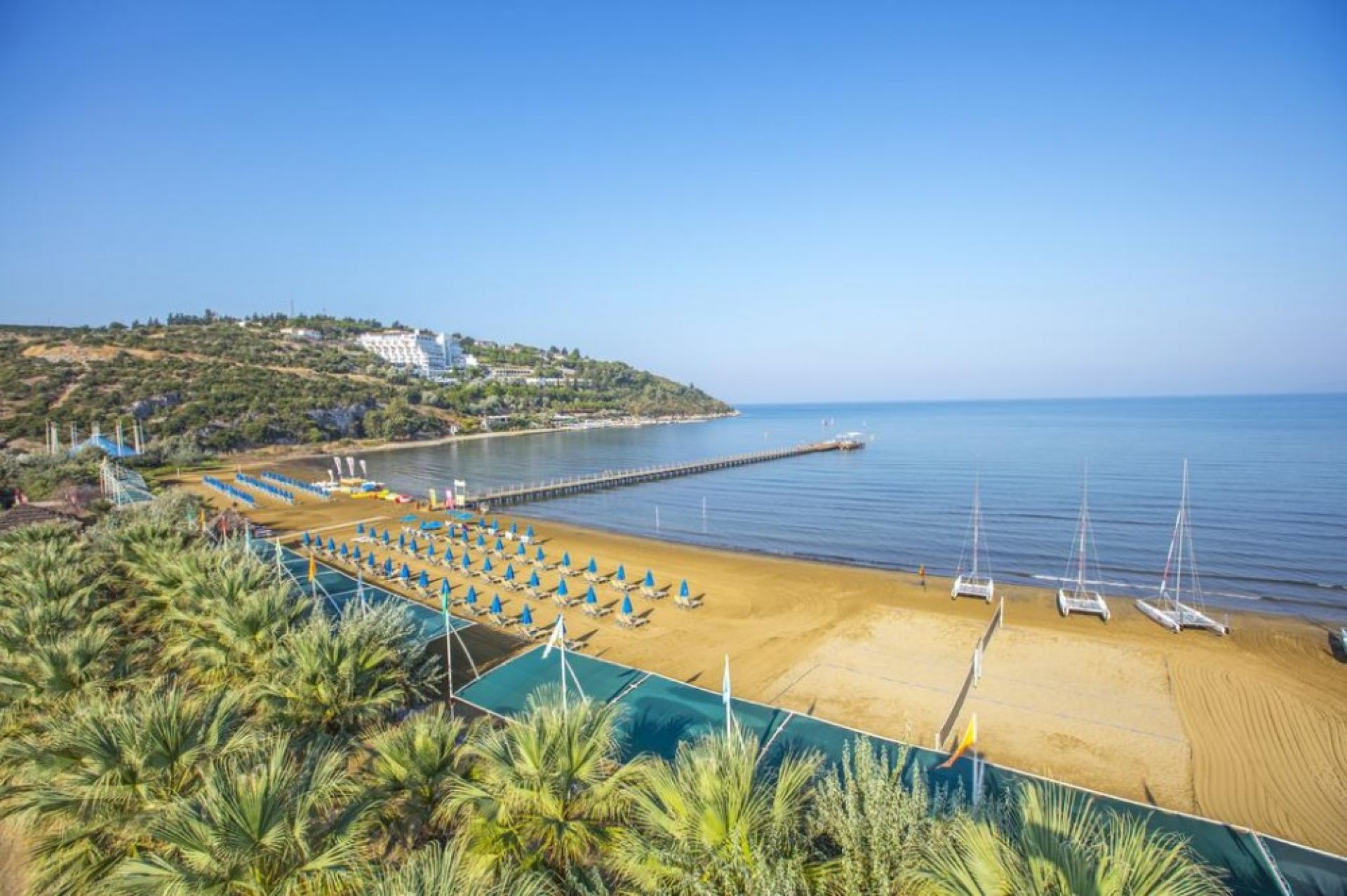 Собствен, пясъчен с дължина 300 м, притежаващ сертификат "Син флаг" и кей със 150 м дължина. Чадъри, шезлонги, матраци и плажни кърпи на плажа и при басейна - безплатно.