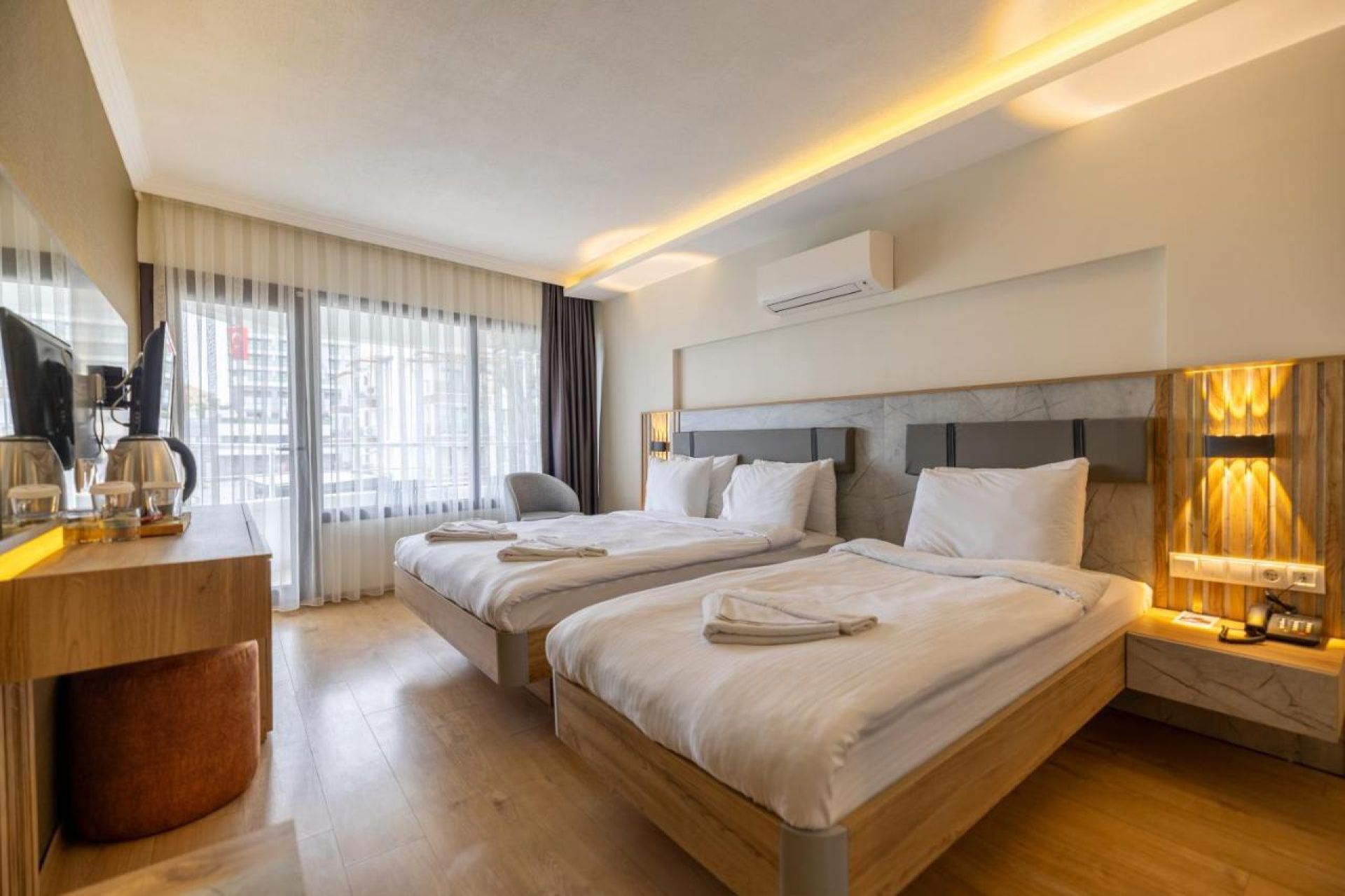 Хотелът разполага с 80 стаи. Всички стаи са оборудвани с климатик, телевизор, телефон, баня с душ, сешоар, минибар, балкон.