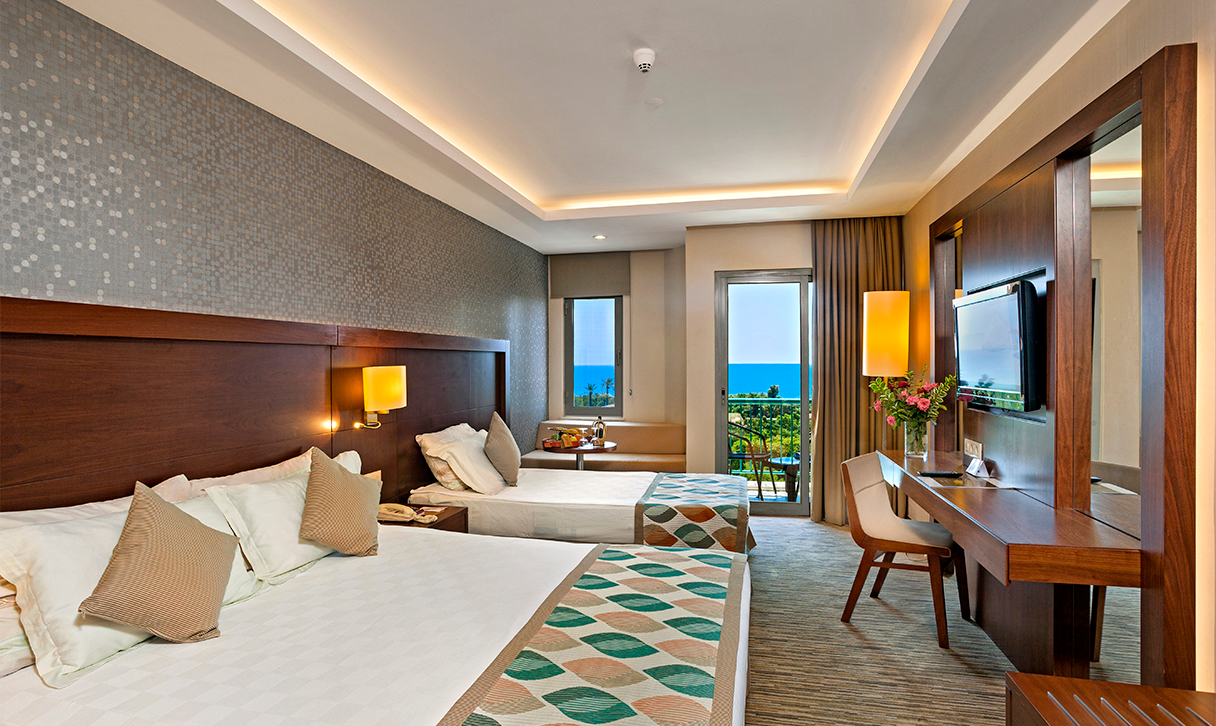 Стаи Main Blocks: 323 стандартни стаи, от които Standard Room Garden View (изглед градина, 30-35 м2), Standard Room Sea View (изглед море, 30-35 м2), 65 Family room (2 спални, 1 баня - 50 м2). 26 делукс стаи, от които Deluxe room garden view (изглед градина, 27-45 м2), Deluxe room sea view (изглед море, 27-45 м2), 2 King suite room (2 спални, 1 хол, 2 бани - 85 м2), 4 Honey moon Suit (стая за младоженци, спалня, баня + джакузи - 45 м2).