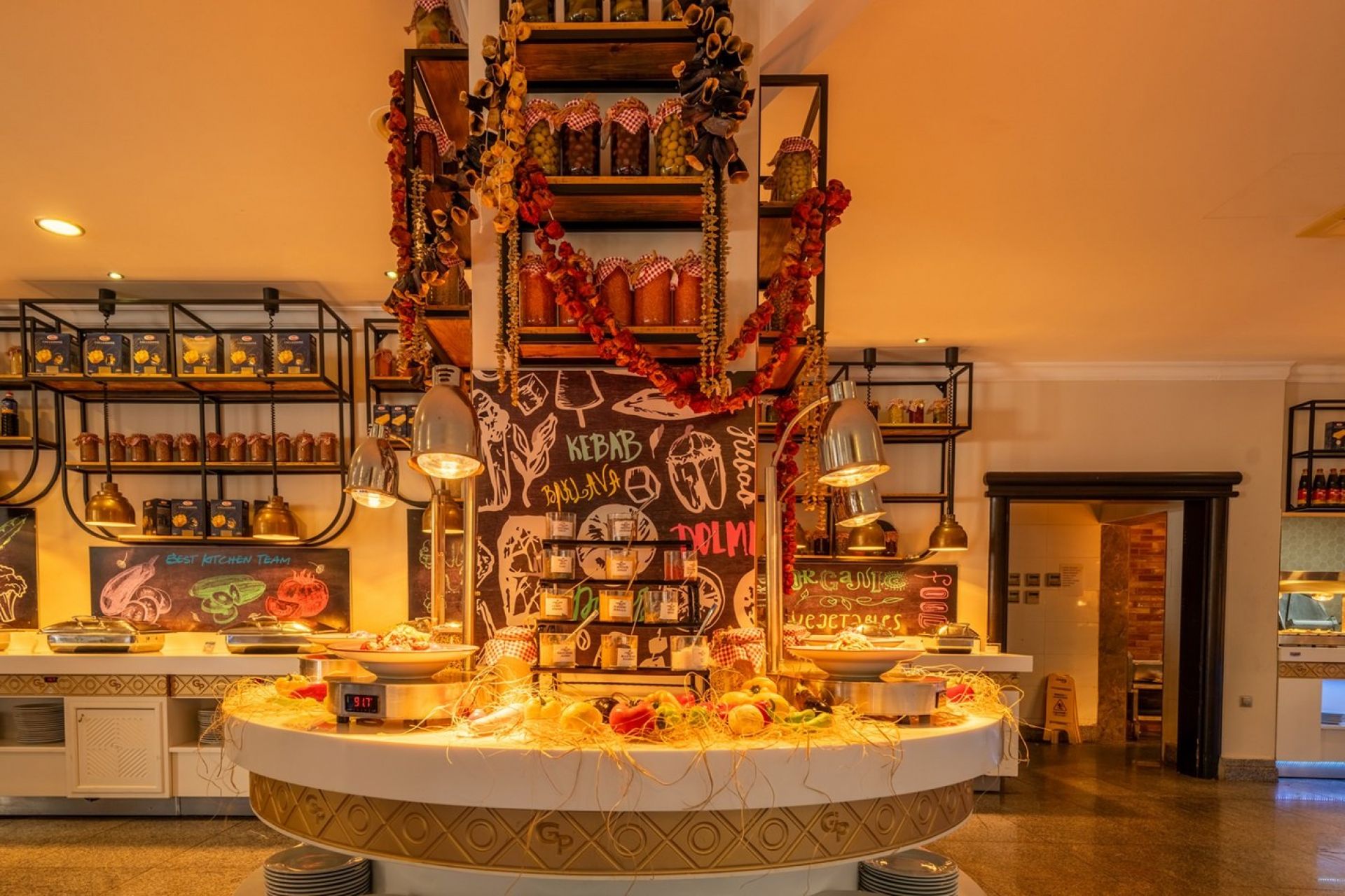Основен ресторант, 1 а-ла-карт ресторант, 3 бара, открит басейн, закрит басейн (отопляем в началото и в края на сезона), детски басейн, 3 водни пързалки, СПА център, , дискотека, лека анимация, магазини, конферентни зали.
