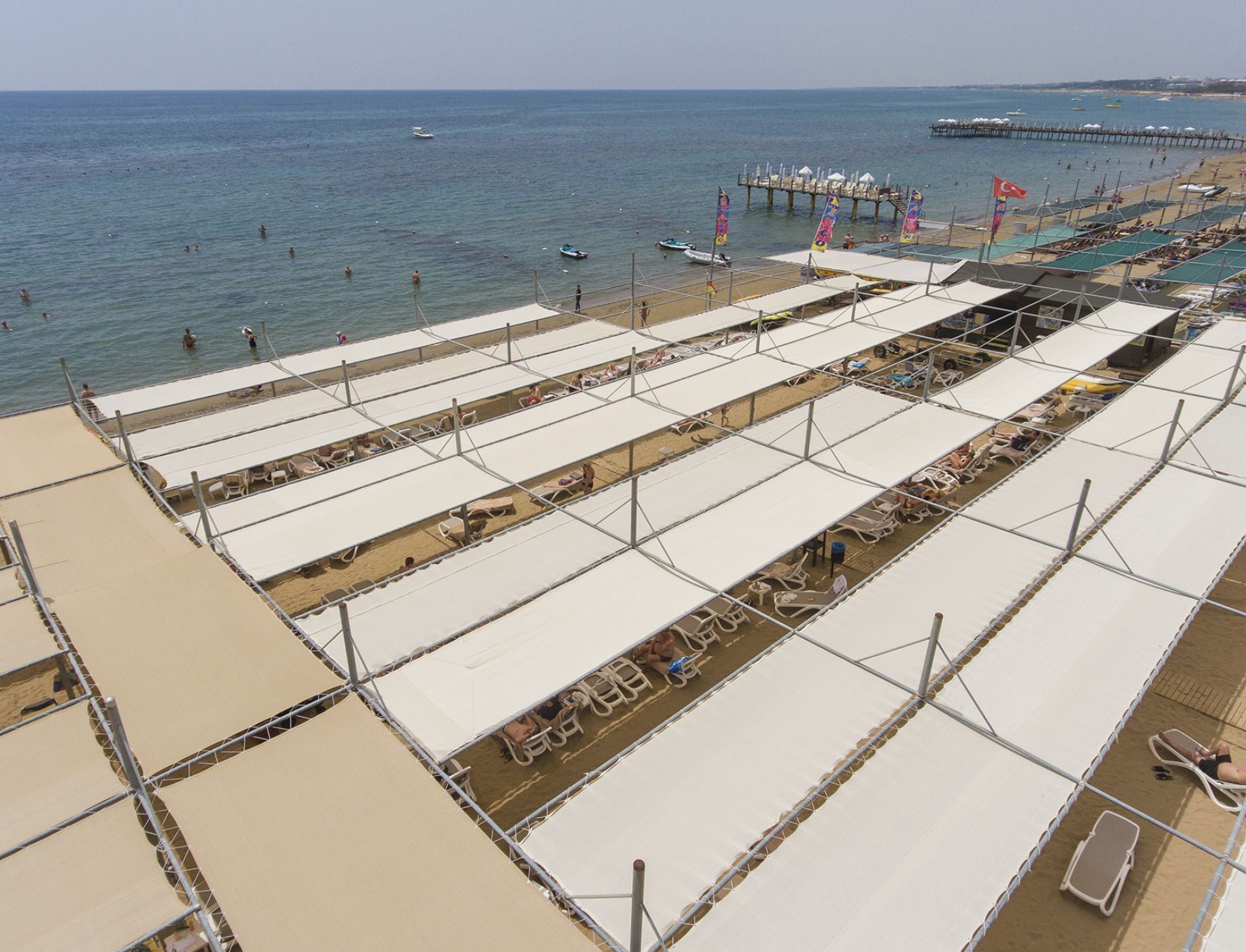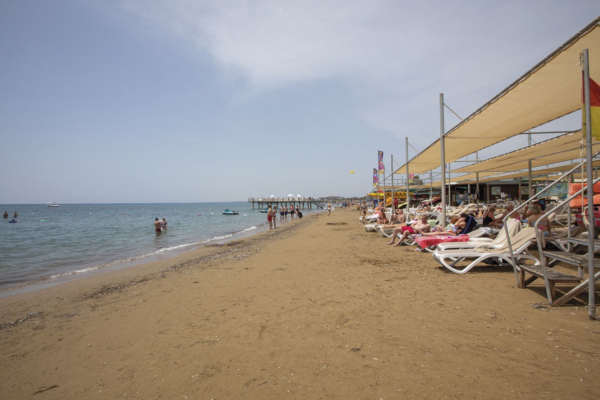 На 300 м. от плажа, пясъчно -чакълест. Чадъри, шезлонги и плажни кърпи на плажа и при басейна - безплатно.