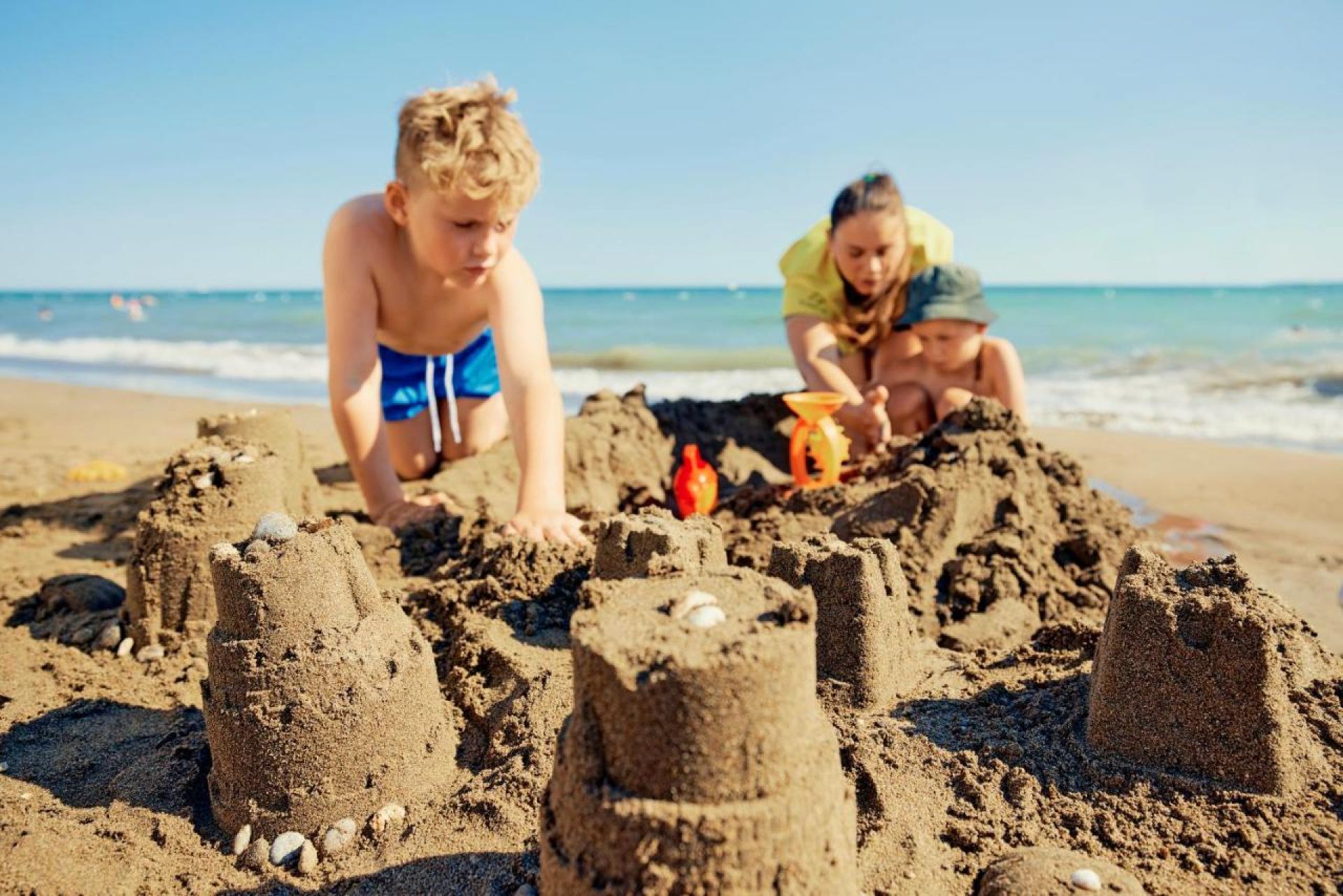 Собствен, пясъчен. Чадъри и шезлонги – безплатно, плажни кърпи – срещу депозит.
