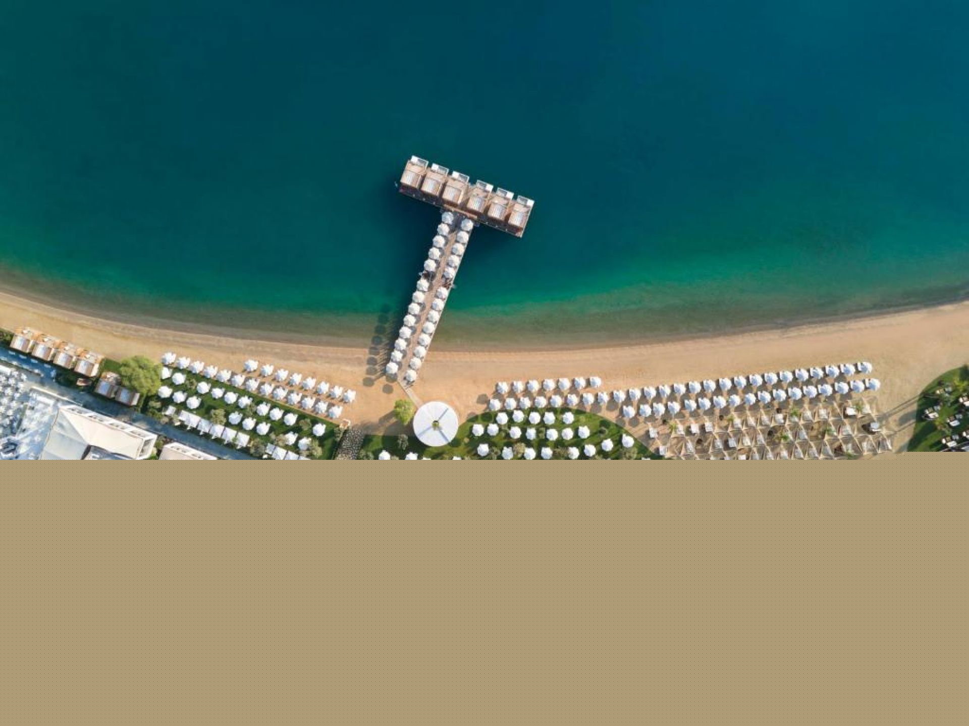 Собствен - 300м пясъчен, разделен на две части - фамилна и само за възрастни 16+; 2 платформи - чадъри, шезлонги и матраци на плажа и при басейна - безплатно.