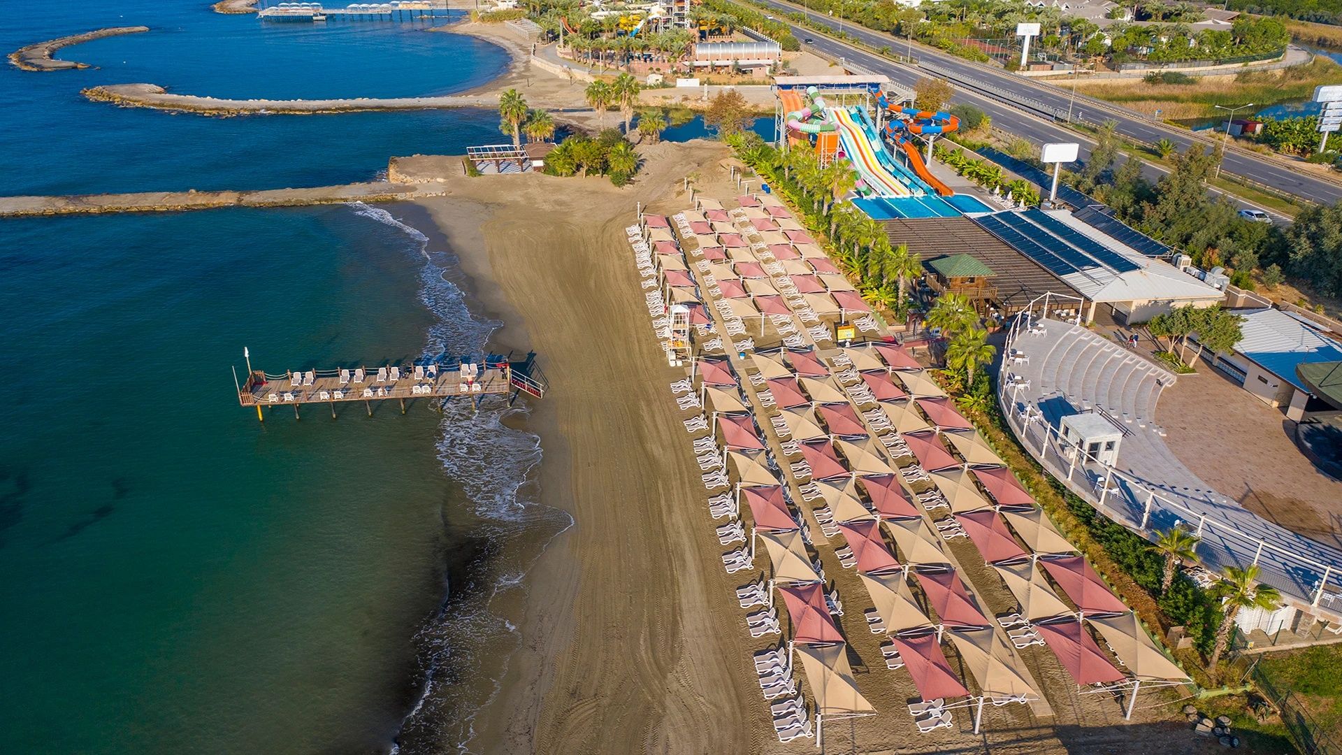 Собствен, пясъченo-чакълен. Чадъри и шезлонги на плажа и при басейна - безплатно. Плажни кърпи - безплатно.