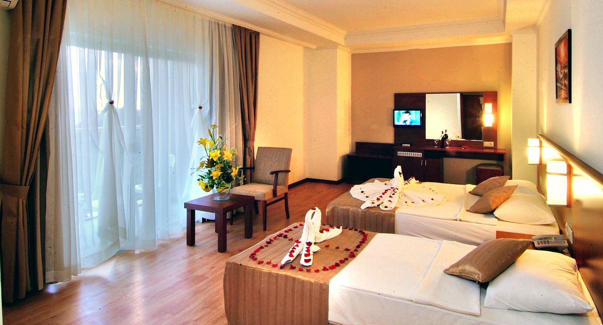 климатик, телевизор, сателитна телевизия, телефон, баня с вана, сешоар, балкон, мини-бар ( вода и безалк. напитки в ден настаняване безплатно ).
