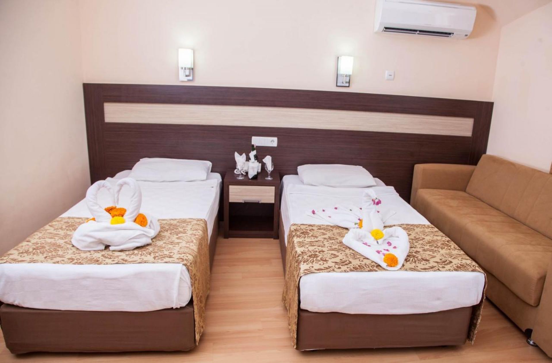 Климатик, телефон, сателитна телевизия, баня с вана или душ, сейф (с/у заплащане), мини бар (зарежда се с вода и сода), сешоар, балкон, под - мокет. Почистване на стаите - всеки ден, смяна на бельото - 3 пъти седмично.