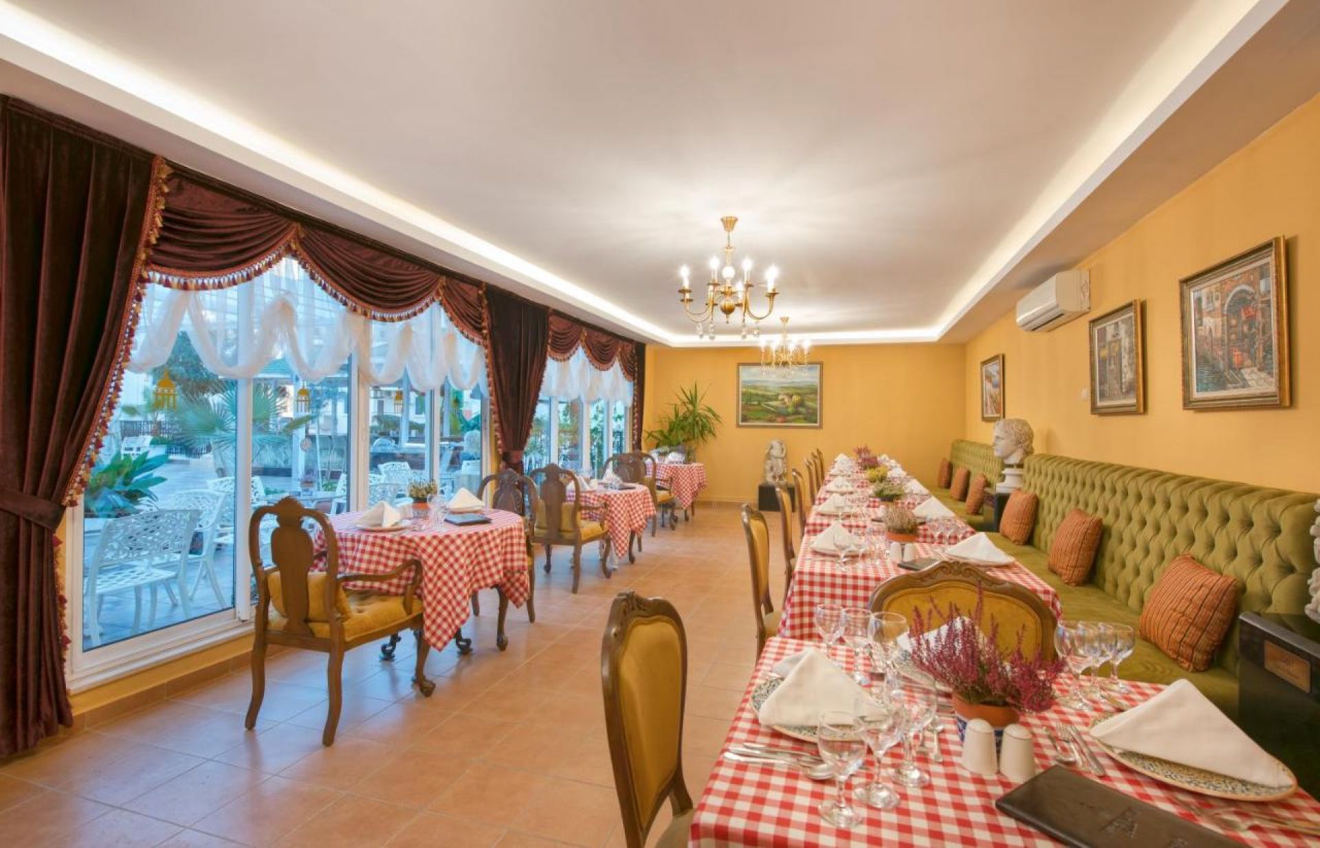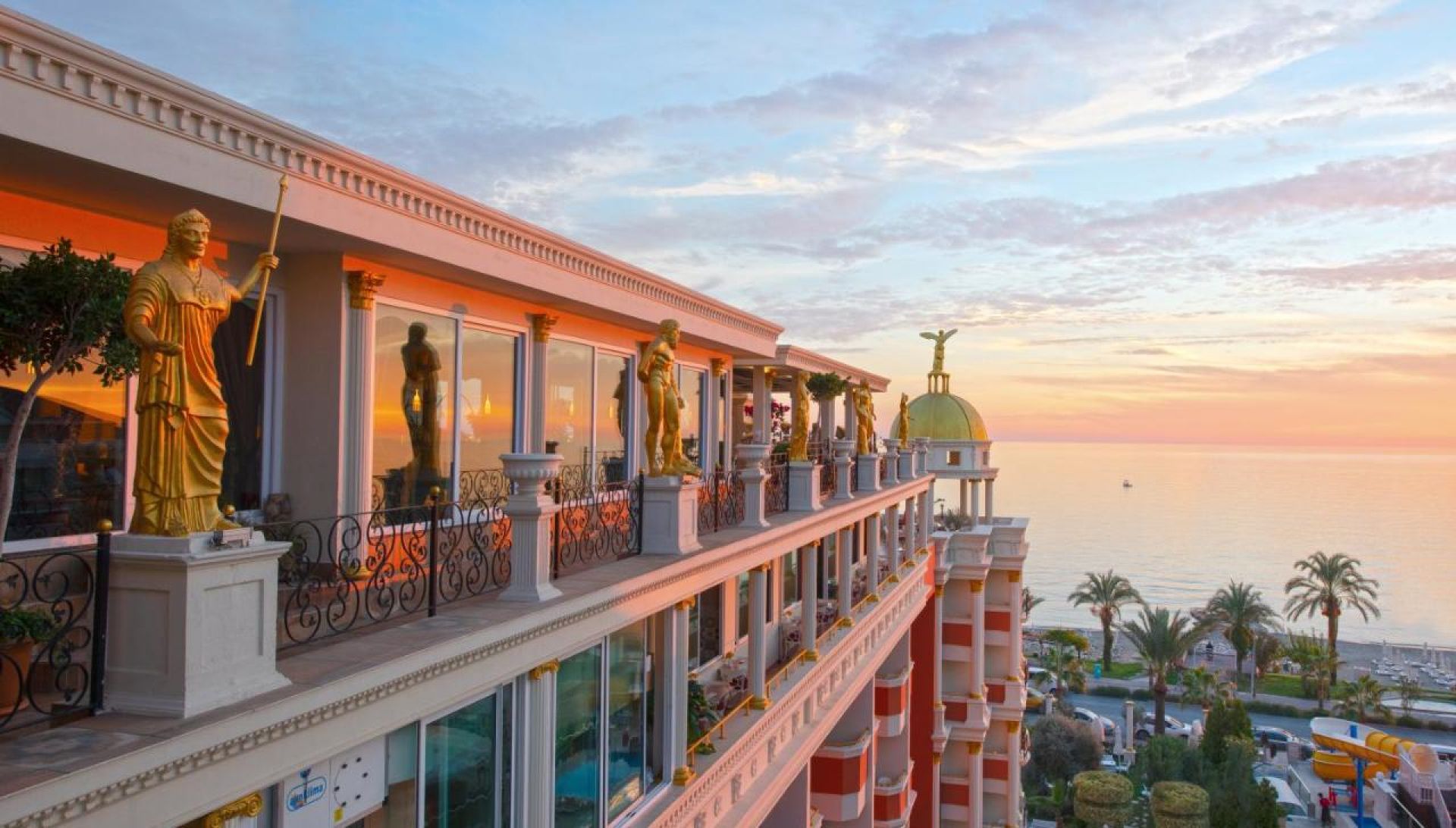 Основен ресторант, а - ла - карт ресторант (с предварителна резервация най-малко 3 дни по-рано - за едноседмичен престой едно безплатно посещение), 3 бара, 2 открити басейнa с водни пързалки, магазин. За децата: детски басейн, анимация, мини клуб (4-12 г.), мини диско. Безплатни услуги: Сауна, турска баня, фитнес, аеробика, водна гимнастика, игри в басейна, тенис на маса, дартс, боча, анимация, Wi-Fi(в лоби). Платени услуги: Масаж, сауна, турска баня, фризьор, лекар, химическо чистене, телефон, факс, боулинг, билярд, водни спортове. ПЛАЖ: На 50 м. от хотела (пез път). Собствен, пясъчно-чакълест. Чадъри, шезлонги и матраци на плажа и при басейна - безплатни. Плажни кърпи – срещу депозит.