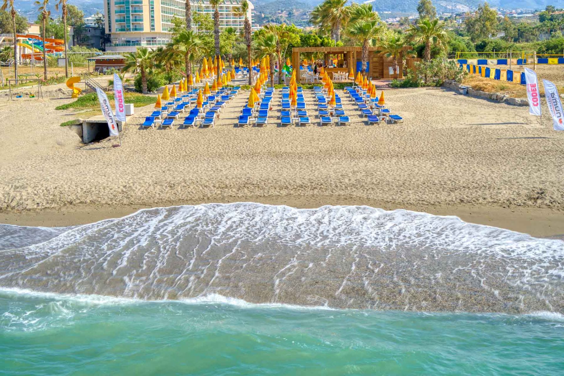Плаж: Собствен, пясъчно-чакълест на 500м. от хотела, до плажа се стига посредством подземен тунел, като се предлага и беплатен шатъл бус.Хотела разполага с бар на плажа. Чадъри и шезлонги-безплатно, плажни кърпи-срещу депозит.