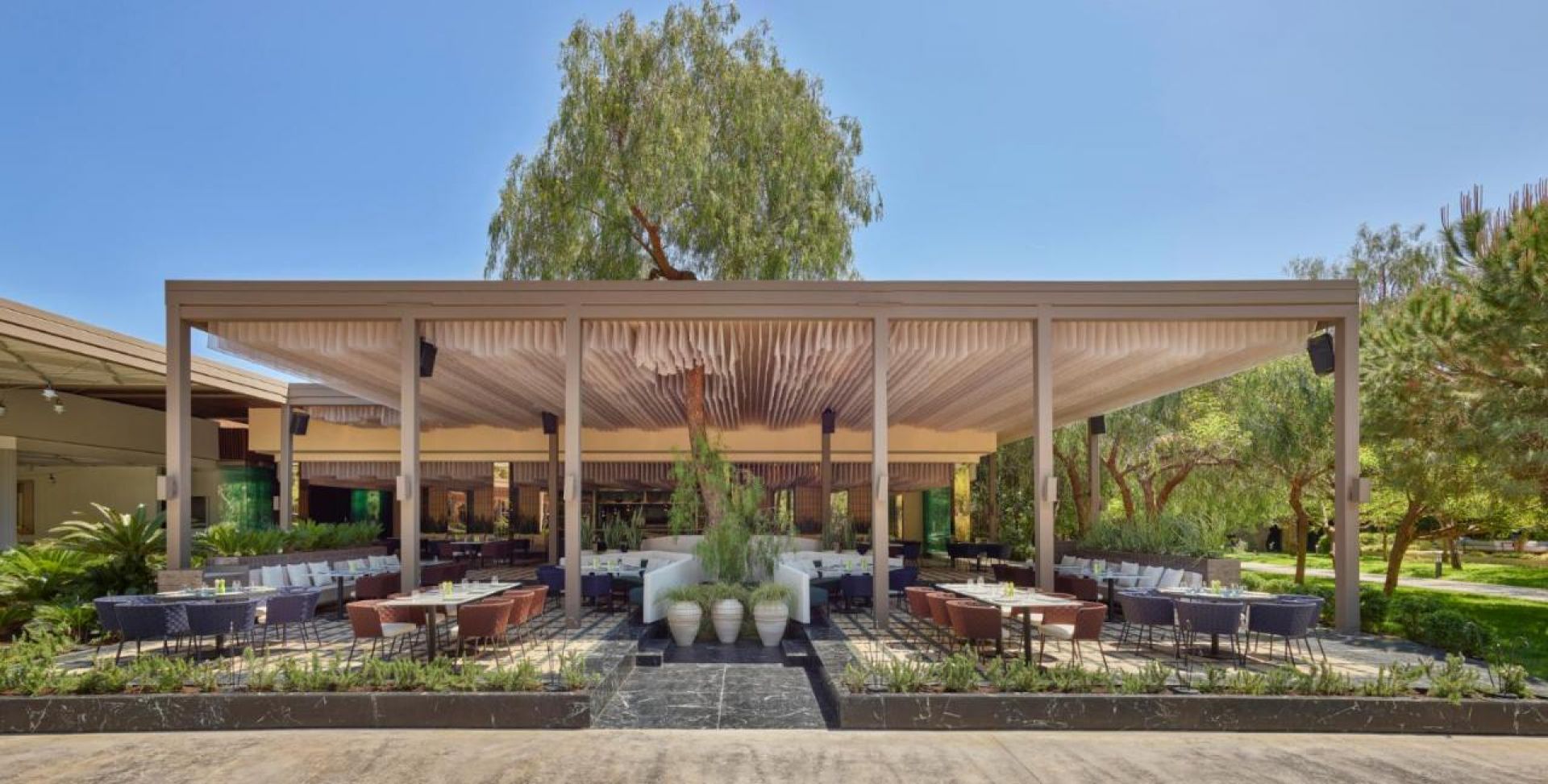 Пет а-ла-карт ресторанта, 11 бара, кафе-сладкарница, шоколадова къща, аквапарк (12+), 3 открити и 1 закрит басейн, тенис корт, футболно игрище, дискотека, магазини, конферентни зали, паркинг. За децата: Детски открит басейн с пързалки, закрит басейн, детски ресторант, детско меню, детска площадка, Mini клуб (4-7г.), Junior клуб (8-12г.), Teen клуб (13-17г.), анимация, мини диско, кино. Безплатни услуги: Сауна, турска баня, парна баня, фитнес, аеробика, йога, тенис корт, тенис на маса (с екипировка), баскетбол, плажен волейбол, водна гимнастика, кану, уиндсърф (с лиценз), дартс, боча, електронни игри, анимация, паркинг. Платени услуги: Масаж, СПА център, фризьор, лекар, химическо чистене, електронни игри, осветление за тенис корт, водни ски, моторни водни спортове, катамаран (с лиценз), уроци по гмуркане, уроци по тенис.