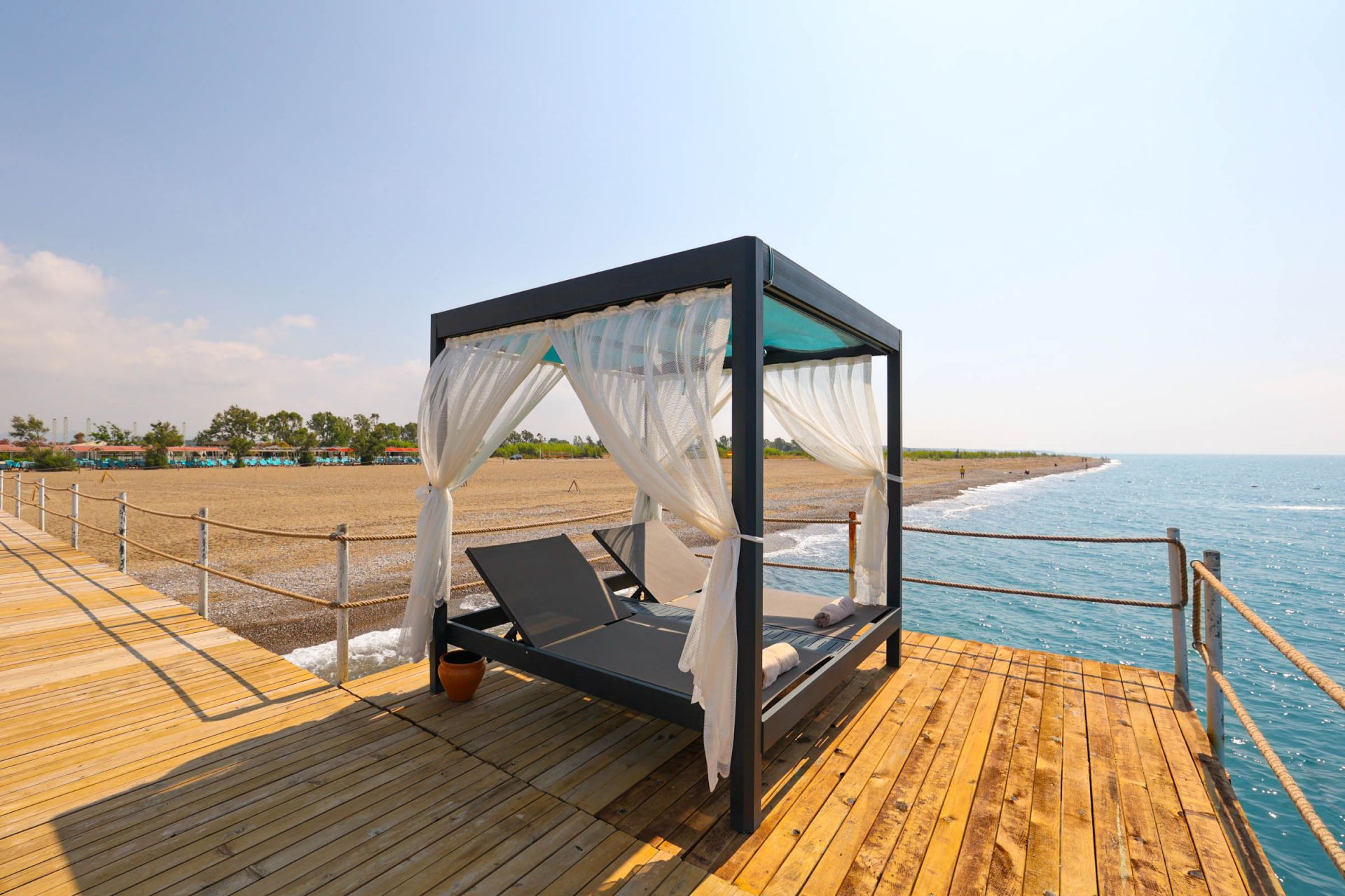 Собствен плаж с пясък и камъчета, на 500 метра от хотела. Безплатен транспорт до плажа по график. Чадъри, шезлонги на плажа и при басейна - безплатно. Плажни кърпи - срещу депозит.