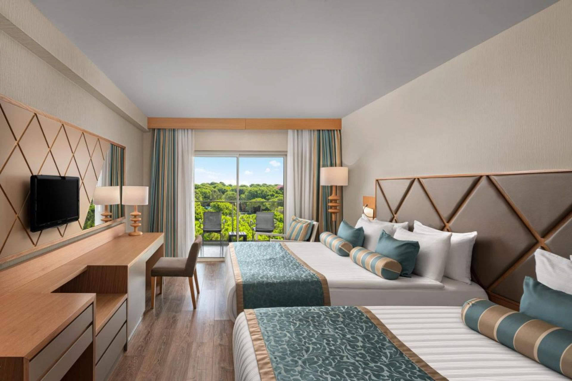 Стаи Main Building: 265 стандартни стаи, от които Standard room land view (изглед суша - 28м2), Standard Room Side Sea View (изглед частично море - 28м2), 3 Handicap room (изглед суша - 30 м2), 12 Executive room (изглед суша - 38 м2), 8 Family room (2 спални, всяка с двойно и единично легло, 2 бани, изглед суша - 56 м2), 10 Connection Family room (2 спални, една стая с 1 двойно и 1 единично легло, и една стая с 2 единични легла, 2 бани - 56 м2), 4 King Suite (2 спални, една с двойно легло и една с 2 единични легла, всекидневна, 2 бани, изглед море - 128 м2).