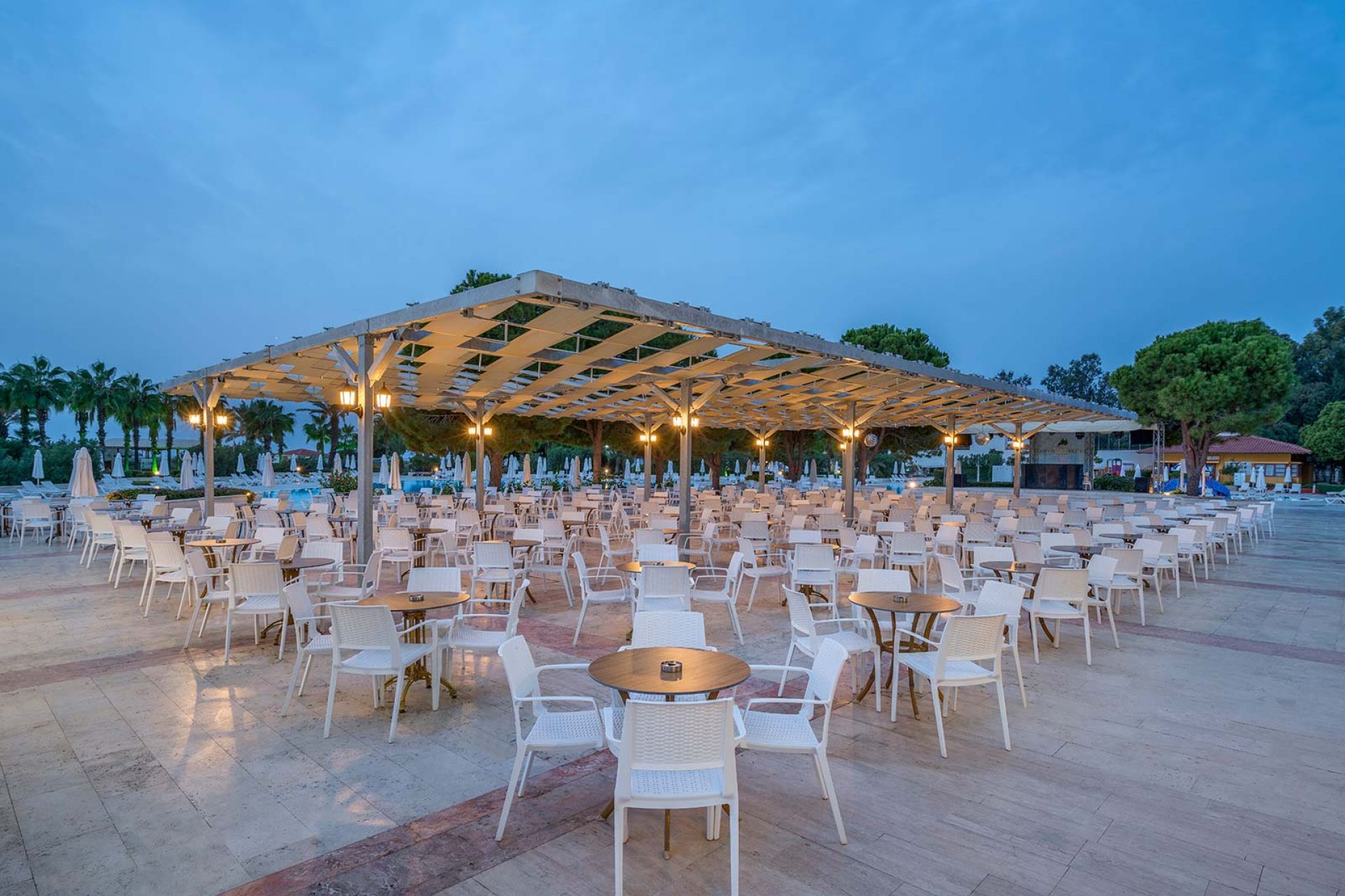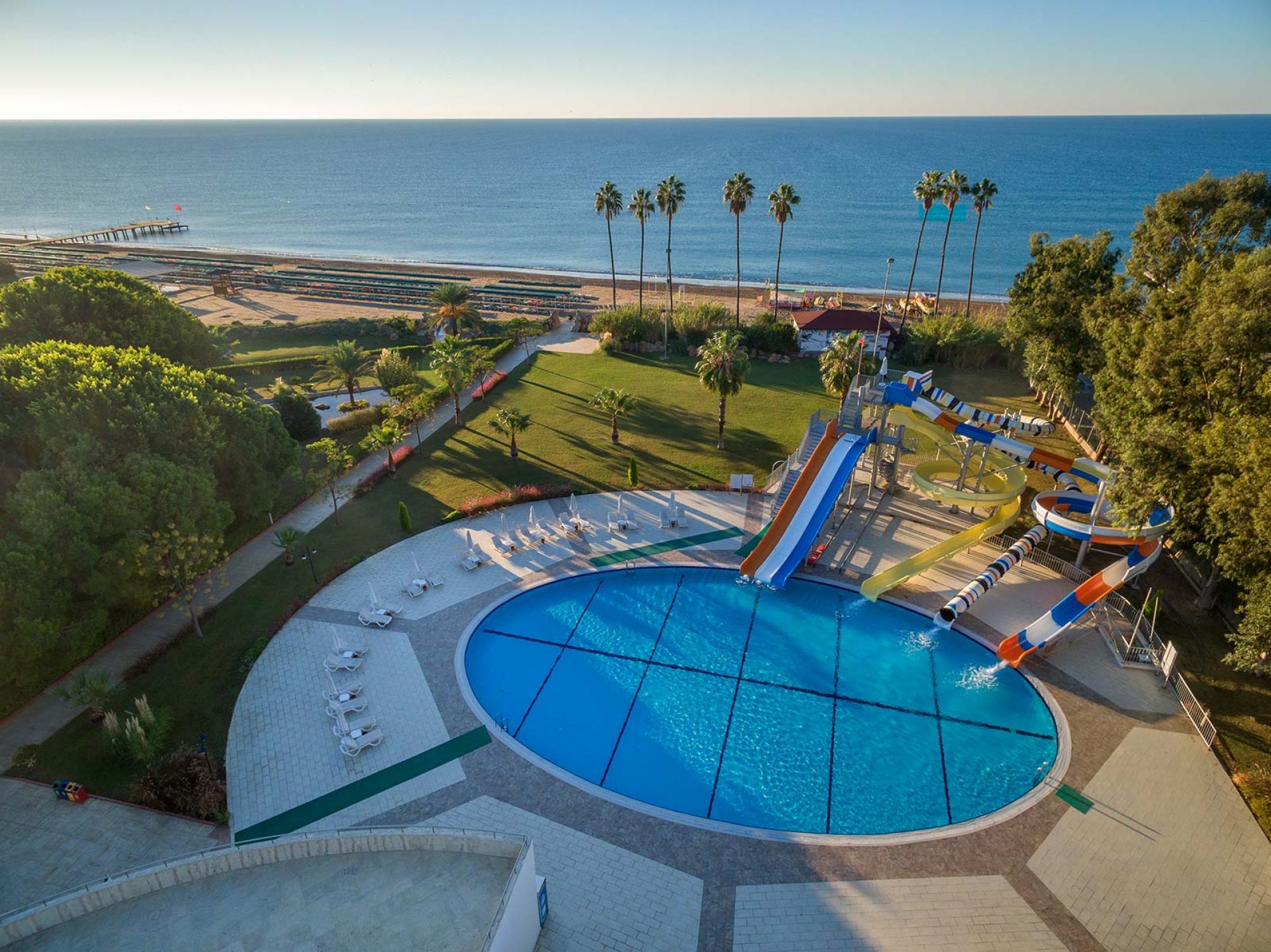 Основен ресторант, 2 а-ла-карт ресторанта – средиземноморски и италиански (платени, с предварителна резервация), 5 бара, 3 открити и 1 закрит басейн, сладкарница, СПА център, водни пързалки, 3 конферентни зали, WiFi – в общите части на хотела, паркинг.
