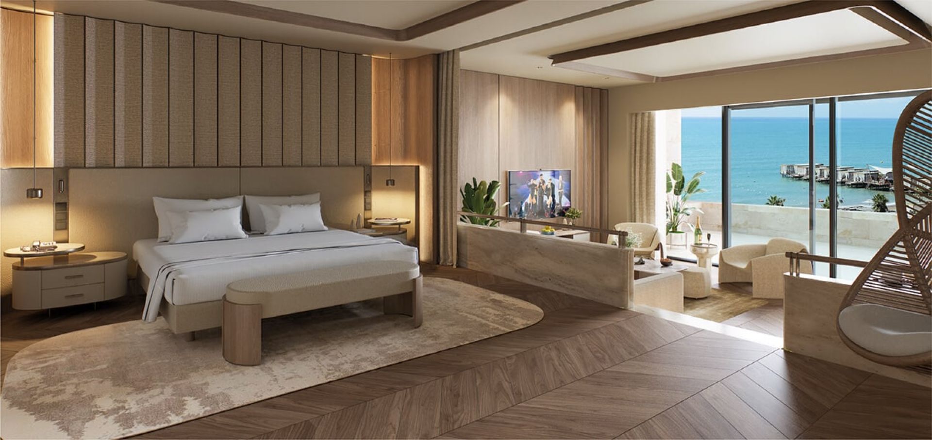Апартаменти Main Building – Seascape Escape (1 спалня, 1 всекидневна, гледка море – 110 м2), Family Suite (2 спални, изглед градина – 125 м2), Grand Family Suite (2 спални, кухненски бокс, всекидневна, изглед градина – 185 м2), Panoramic Suite (1 спалня, кухненски бокс, всекидневна, изглед море – 215 м2), Horizon Suite (2 спални, кухненски бокс, всекидневна, изглед море – 200 м2), Crown Horizon Suite (3 спални, кухненски бокс, всекидневна, изглед море – 450 м2), Crown Signature Suite (5 спални, кухненски бокс, всекидневна, СПА зона, изглед море – 1700 м2), Amber Lagoon Suite (1 спалня, 1 всекидневна, изглед градина и директен достъп до общ басейн – 90 м2), Amber Lagoon Villa (2 спални, кухненски бокс, всекидневна, изглед градина и директен достъп до общ басейн – 155 м2)