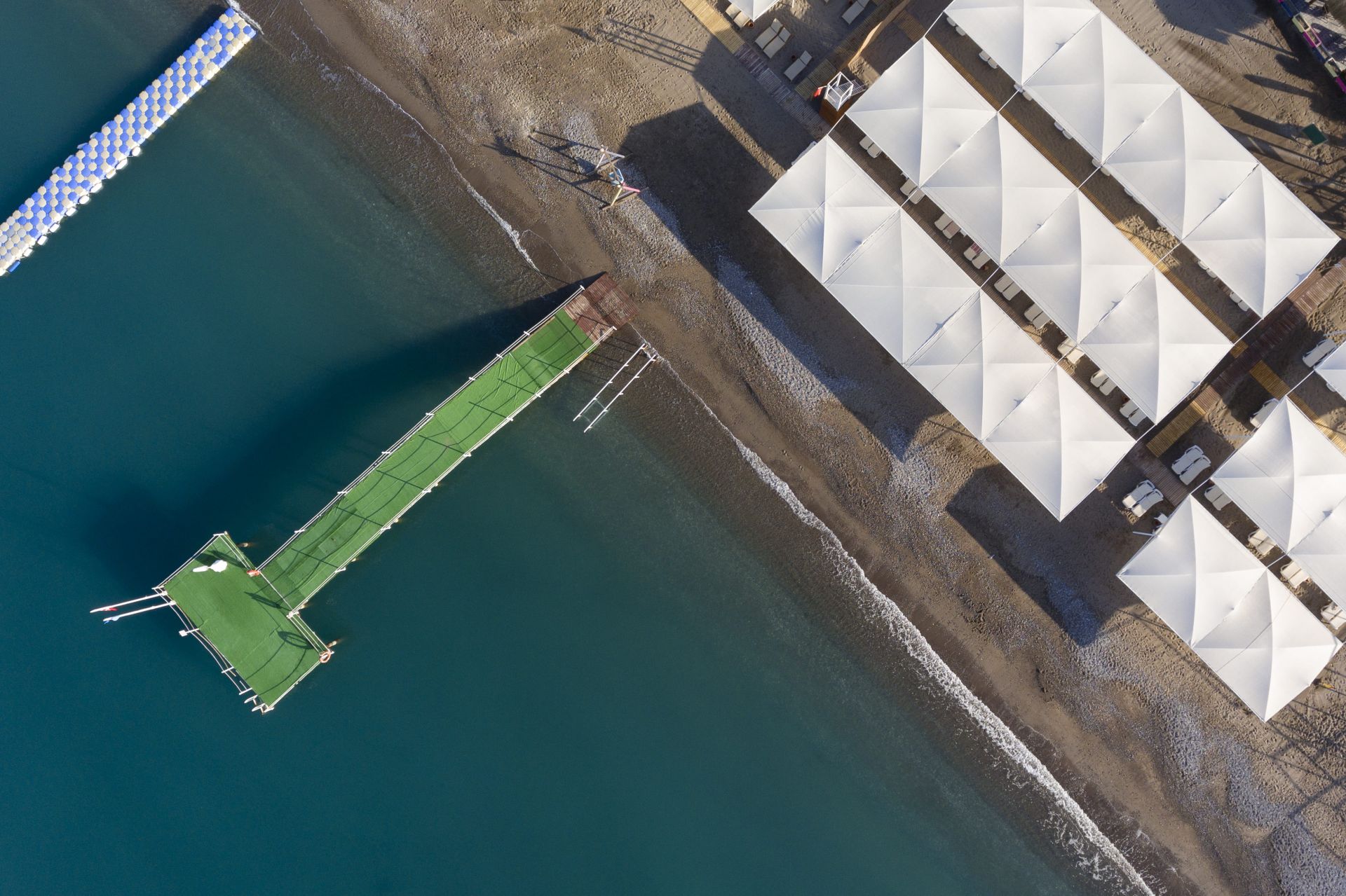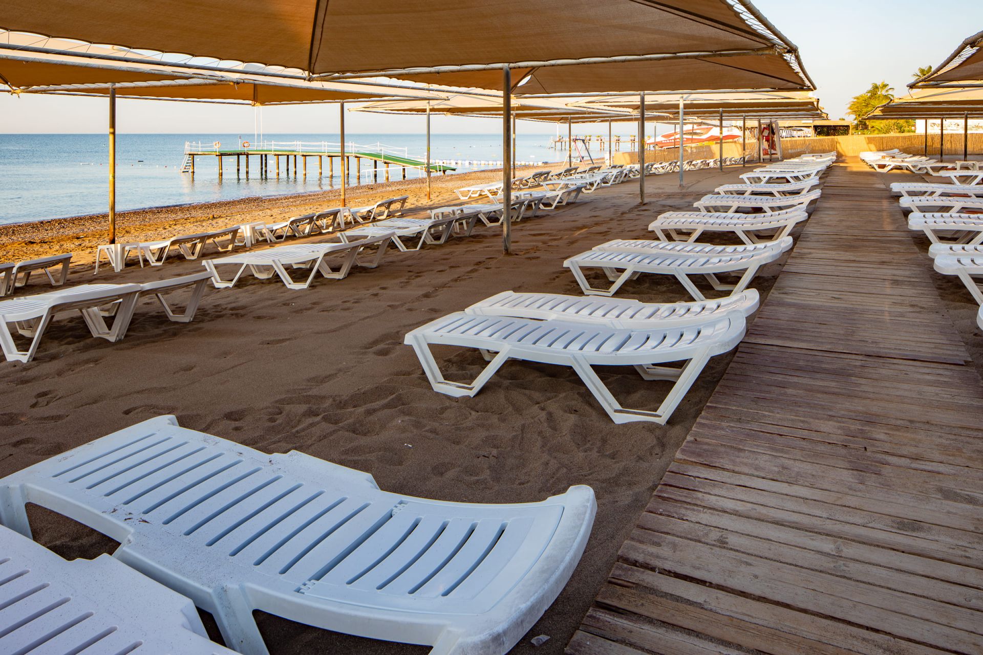 Собствен пясъчно-чакълест плаж. Чадъри, шезлонги, матраци н а плажа и при басейна– безплатно.