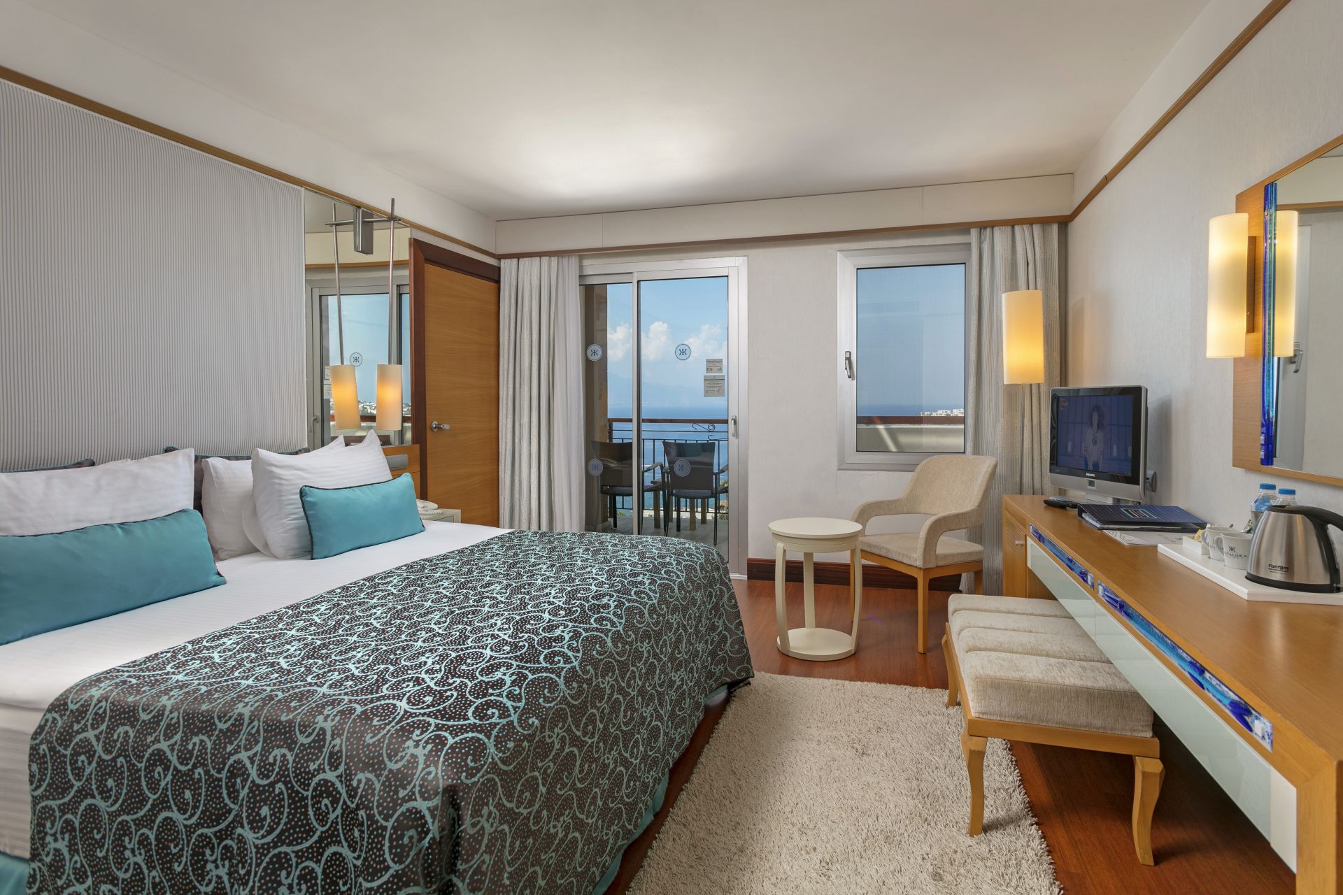 Стаи Main Building: Sea view room (спалня, баня, балкон - 27 м²), Deluxe Room Sea View (спалня, баня, балкон - 36 м²), Standard large room sea view (спалня със зона за сядане, баня, балкон - 34 м²), Junior suite room sea view (спалня със зона за сядане, баня, балкон - 56 м²), Family suite room sea view (2 спални, баня, тераса - 79 м²), Connection room sea view (2 спални с топла връзка, баня, тераса - 54 м²), Superior Suite Swim Up (2-етажна вила с 2 спални, с директен достъп до общ басейн, баня - 180 м²).