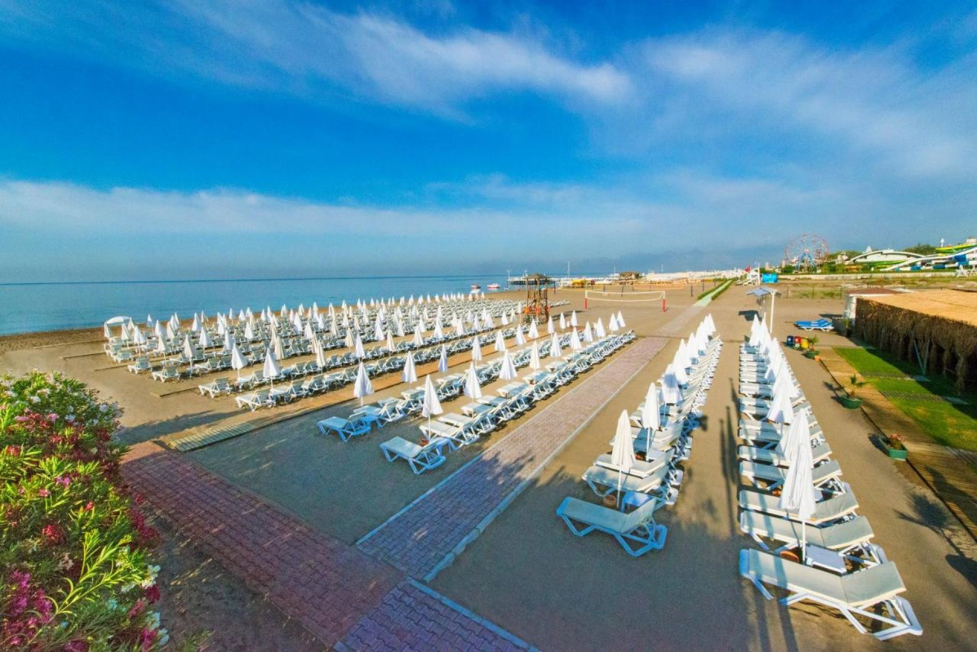 Собствен, на 200 м. от хотела, пясъчен. Чадъри, шезлонги и плажни кърпи на плажа и при басейна - безплатно.