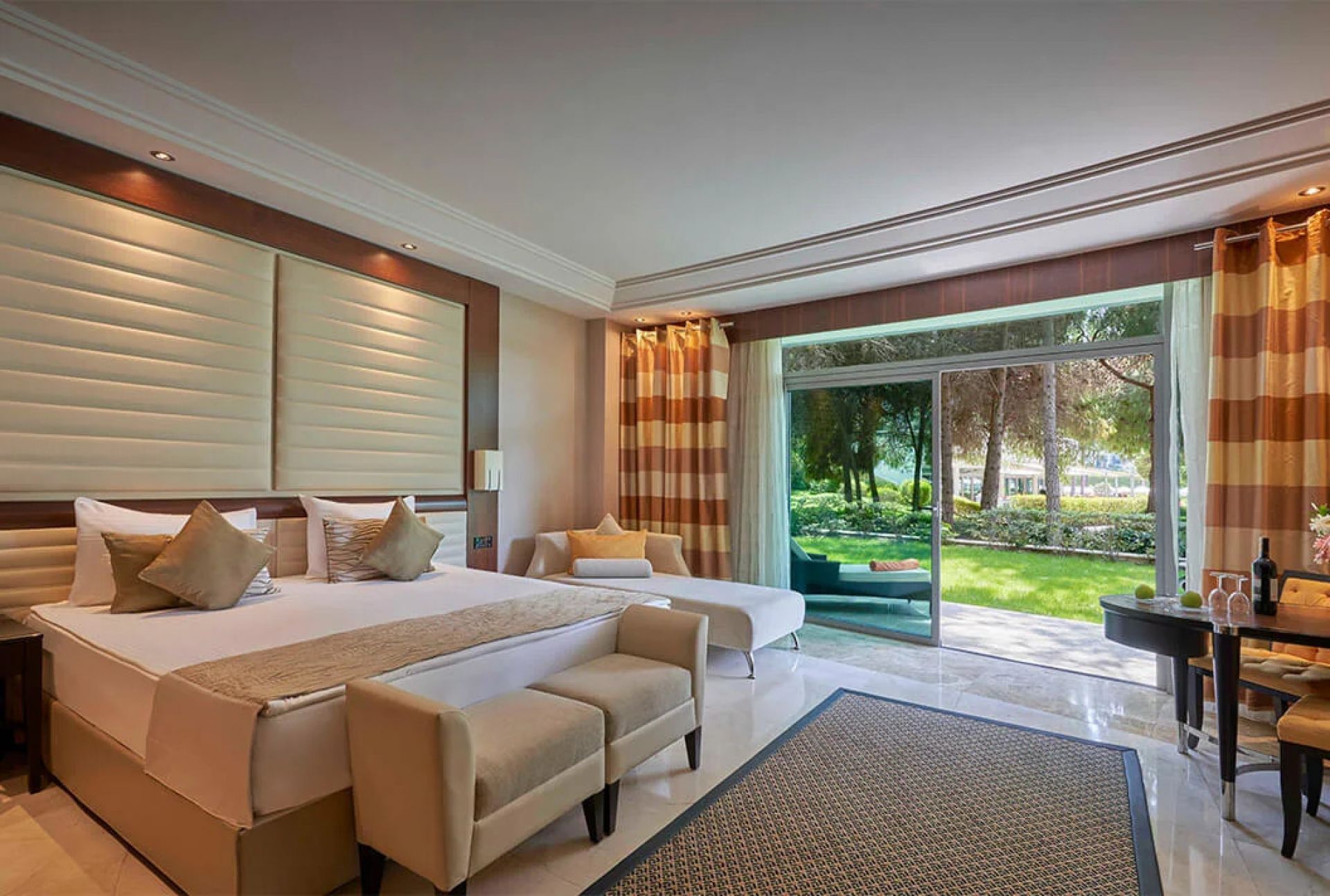 Хотелът разполага общо с 502 стандартни стаи и 63 фамилни стаи. Всички стаи са оборудвани с: климатик, сателитна телевизия, телефон, баня с душ или вана, сешоар, минибар (безплатно), балкон, интернет. Почистване на стаите – всеки ден.