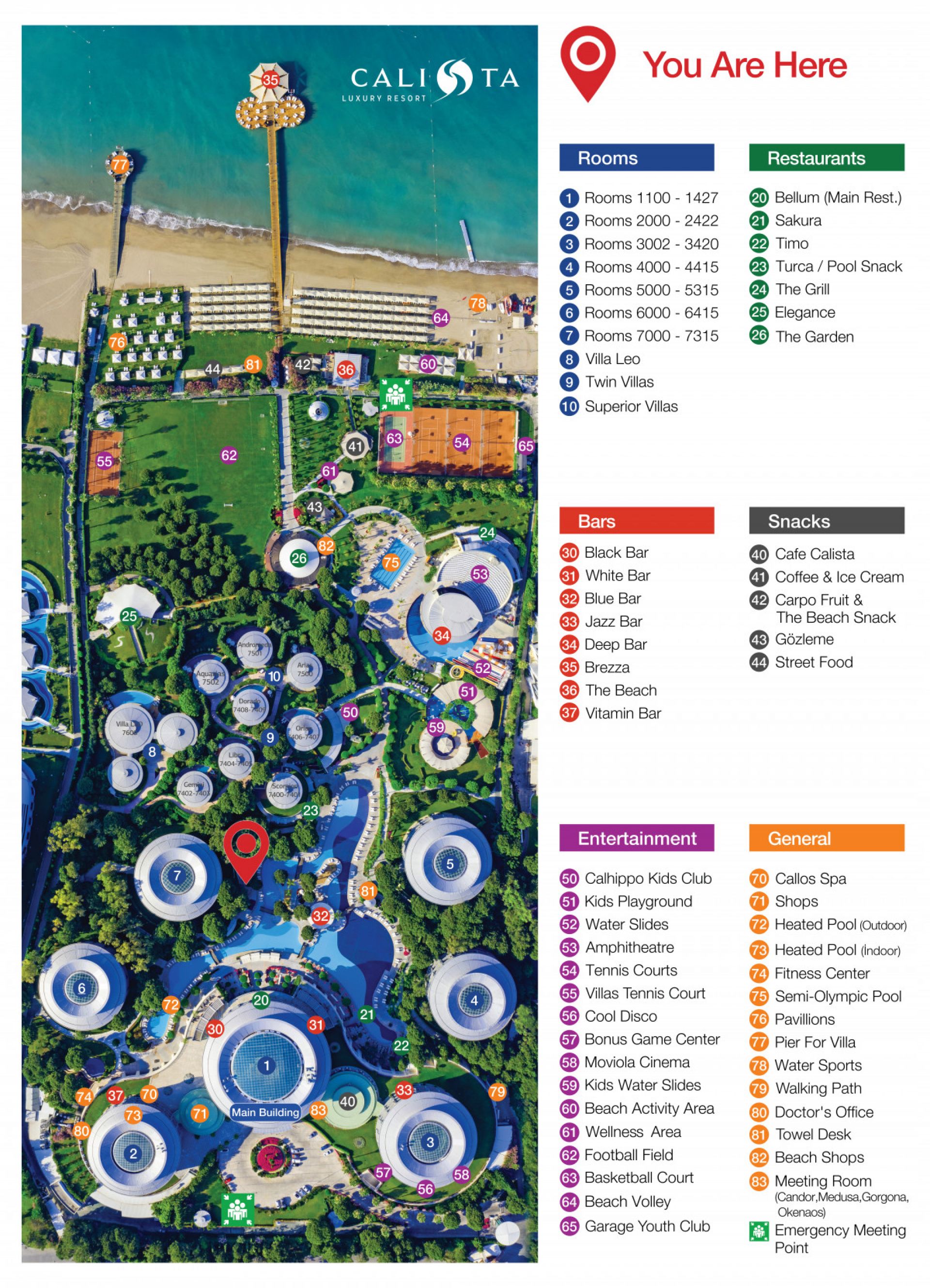 Основен ресторант, 6 а - ла - карт ресторанта (с предварителна резервация), 8 бара, VIP ресторант, дискотека, 4 открити и 2 закрит басейна, 4 водни пързалки, магазини, Спа център, конферентни зали, паркинг.