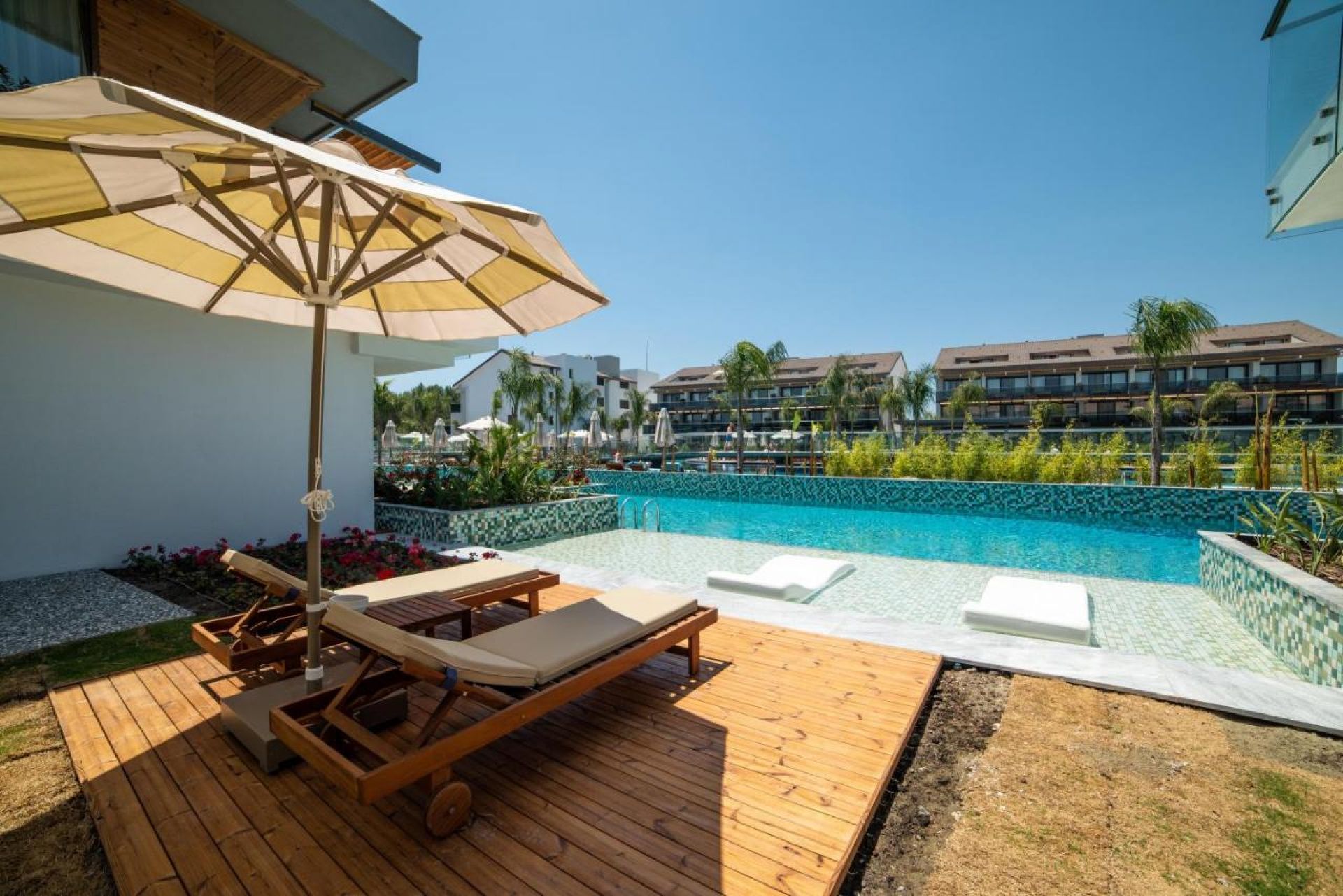 Lake House Swim-Up Suite (78 кв. м) – Стилен и модерен дизайн, директен достъп до басейна и шезлонги и чадъри за почивка.
