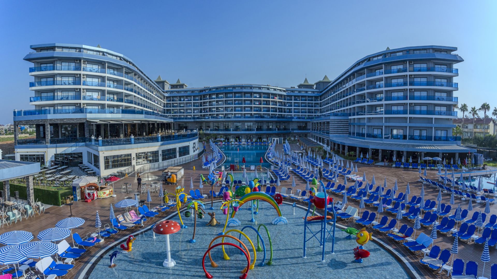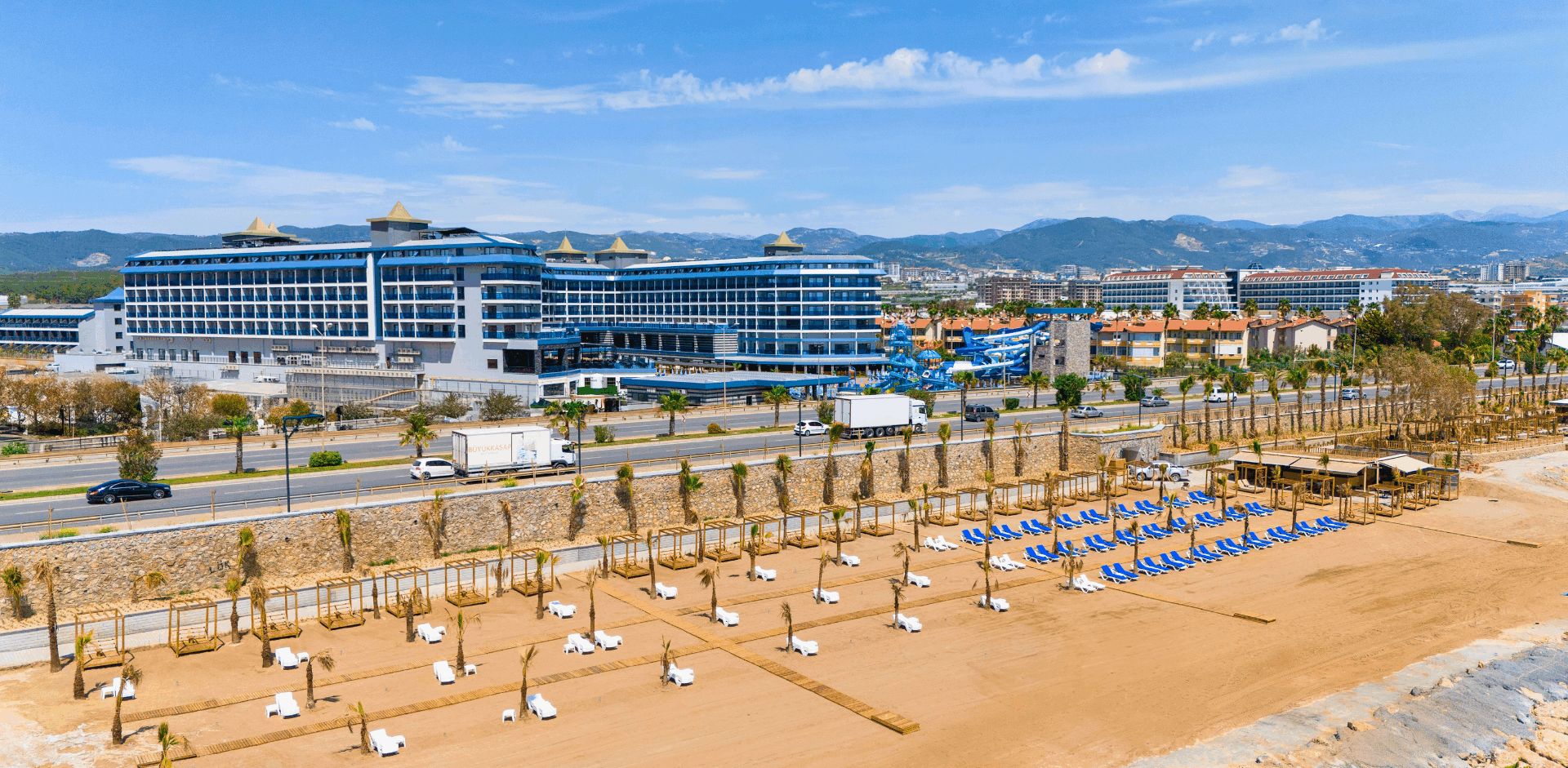 Намира се на 100 км от летище Анталия, на 110 км от центъра на Анталия, на 18 км от центъра на Алания, на 250 м от брега на морето, чрез подлез. Построен 2024 г., на обща площ от 43 000 м2. Достъп до Еftalia Island, разположен на плажа, състоящ се от аквапарк с басейни, водни пързалки и заведения.