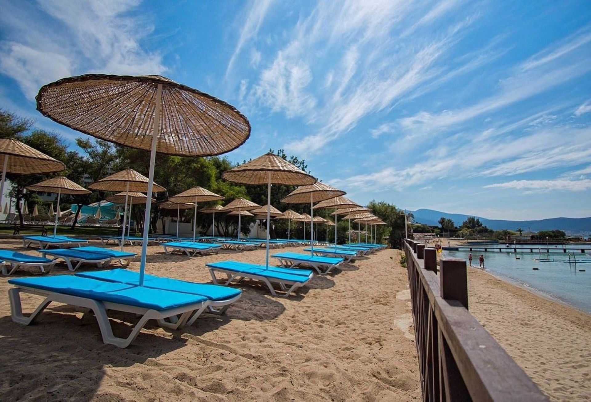 Собствен, пясъчен. Чадъри, шезлонги, матраци и плажни кърпи на плажа и при басейна - безплатно.