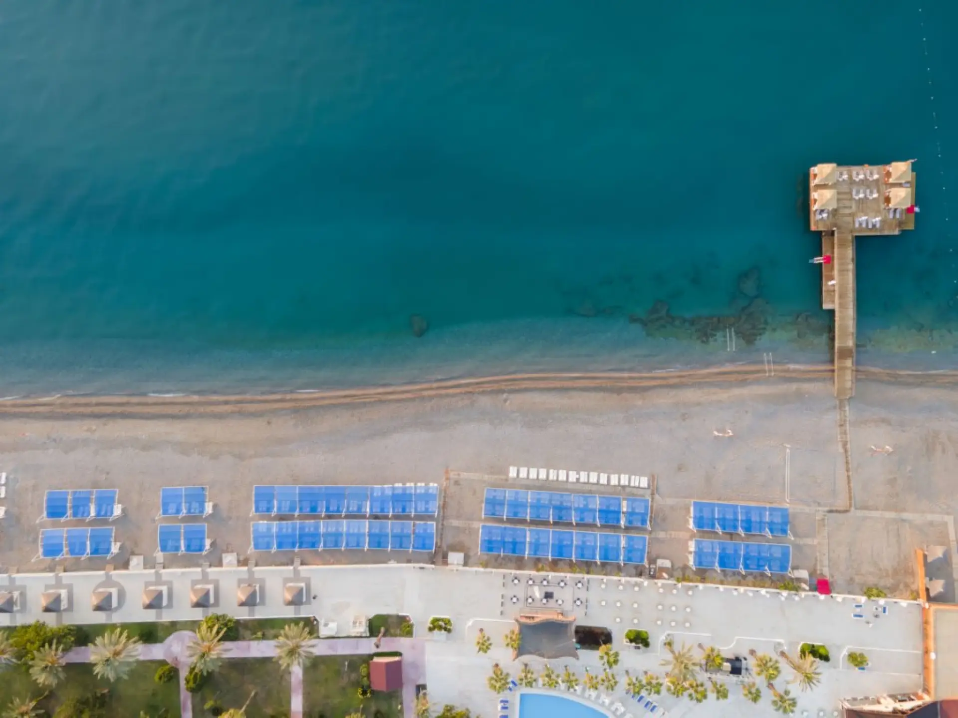 Собствен, пясъчно-чакълест с дължина 150 м. и собствен док. Чадъри и шезлонги на плажа и при басейна – безплатно. Плажни кърпи – безплатно.